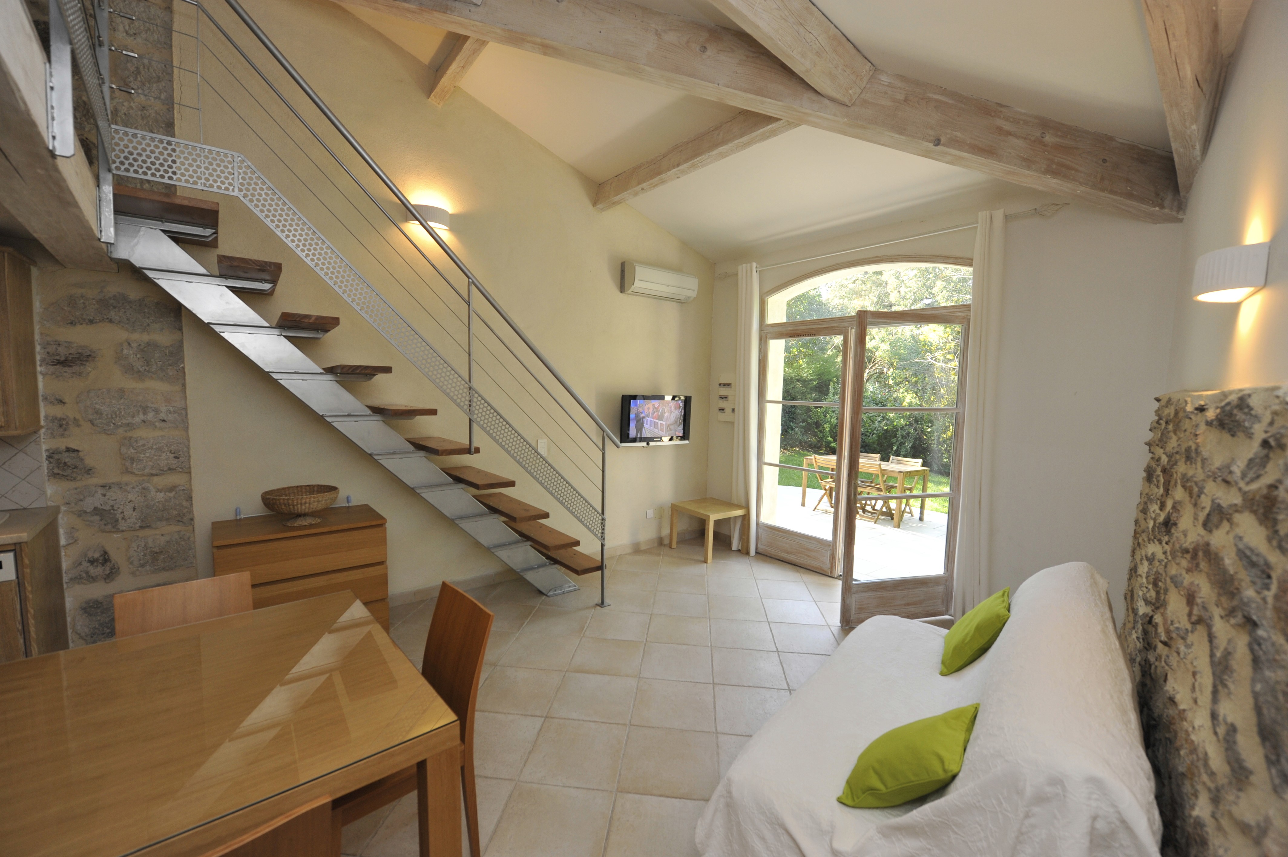 Studio de 30 m² avec jardin privé. Couchage 2/4 personnes : 1 canapé lit 160×200 et 2 lits une personne en mezzanine.